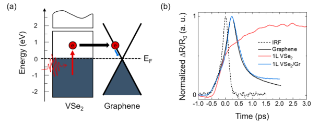 Figure 3. 1L VSe2/Gr界面處的層間熱電子轉(zhuǎn)移。(a)從VSe2到Gr的層間熱電子轉(zhuǎn)移的示意圖。(b)Gr,1L VSe2和1L VSe2/Gr的時間分辨的TR結(jié)果。