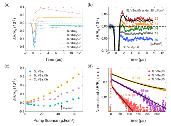Figure 4.(a)3L,5L和7L VSe2/Gr的時間分辨TR測量。(b)3L VSe2/Gr在各種泵注量下的TR信號。(c)從每個樣品獲得的泵浦流量相關(guān)的TR信號。(d)MtL VSe2/Gr中的衰減特性。