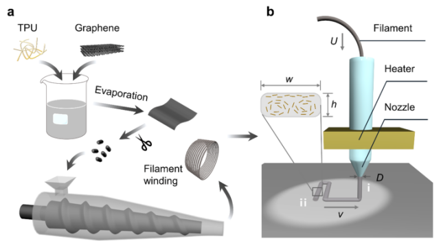 Figure 1. (a)石墨烯/TPU細(xì)絲的合成示意圖。(b)石墨烯/TPU復(fù)合材料的典型FDM印刷工藝,包含擠壓(i)和沉積(ii)工藝。