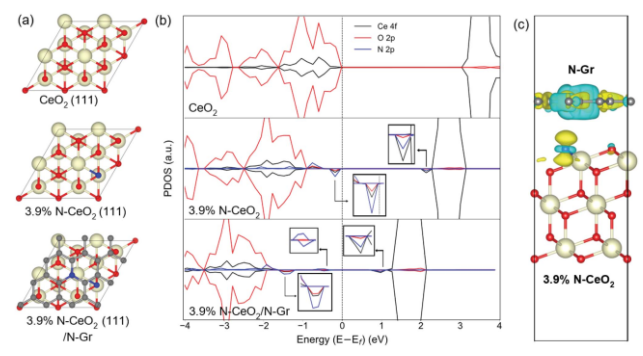 Figure 3(a)模擬CeO2(111),3.9%N-CeO2(111)和3.9%N-CeO2(111/N-Gr的俯視圖。(b)預(yù)測狀態(tài)密度(PDOS)。(c)3.9%N-CeO2/N-Gr結(jié)構(gòu)的三維電荷密度差。