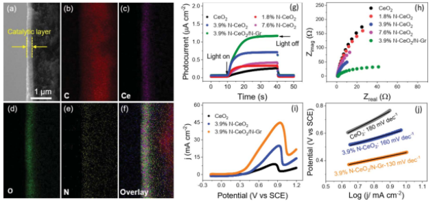 Figure 4通過FESEM對3.9%N-CeO2/N-Gr電極的顯微組織觀察:(a)橫截面圖和(b–f)C(紅色),Ce(粉紅色),O(綠色),N(黃色)的EDS元素映射。純CeO2/C,3.9%N-CeO2/C和3.9%N-CeO2的,室溫光電催化特性:(g)在0.2 V偏置電壓下的瞬態(tài)光電流響應(yīng),(h)在50 mV s-1掃描速率下進(jìn)行EIS測量。(i)在N2飽和的0.1 M H2SO4 + 0.5 M CH3OH溶液中的MOR評價(jià),(j)塔菲爾斜率。