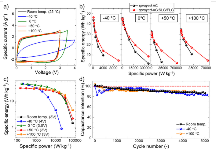 Figure 4. a)噴涂的AC:SLG/FLG的CV曲線。b)通過(guò)分析GCD曲線得出的比能量和比功率的關(guān)系。c)在不同溫度(即−40、0、25、50和100°C)下噴涂AC:SLG/FLG的Ragone圖。d)在−40、25和100°C下,在1 A g