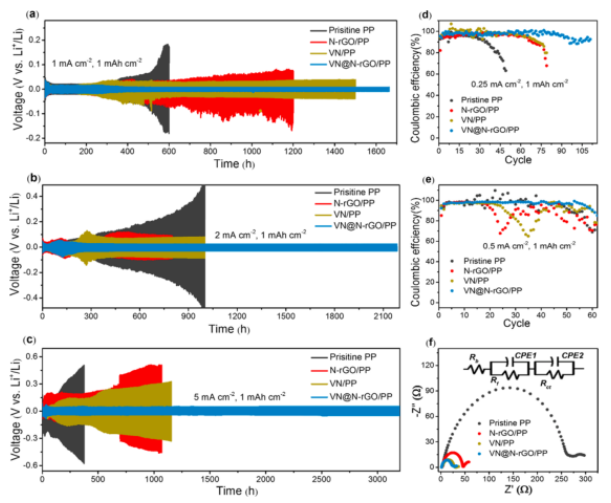 -2下,使用了VN@N-rGO/PP隔膜的鋰電池,即使在2500小時以上仍能很好地工作,表現(xiàn)出超高的循環(huán)穩(wěn)定性。本文提出了一種適合于無枝晶超穩(wěn)鋰基電池的三維多孔多功能中間層的合理設(shè)計思想和制造策略。