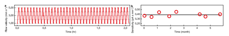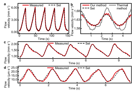 通過集成在超低功率或自持系統(tǒng)中的電納米傳感器,對生物流體流速進(jìn)行全電子詢問,有望實現(xiàn)各種新興的研究和應(yīng)用。然而,現(xiàn)有的納米電流量傳感技術(shù)仍然缺乏精確性和穩(wěn)定性,通常只適用于簡單的水溶液或液/氣雙相混合物,這使其不適用于監(jiān)測低流量(~微米/秒),但卻具有連續(xù)生物液體的重要特性(如微循環(huán)中的血液流變行為)。在這里,我們展示了單層石墨烯單微電極從連續(xù)的水流動中收集電荷是一種有效的流量傳感策略,該策略可提供比其他電氣方法高幾個數(shù)量級的關(guān)鍵性能指標(biāo)。特別是,在微流控芯片中獲得了超過六個月穩(wěn)定性和亞微米/秒分辨率,實時定量全血流的多尺度幅度-時間特性。