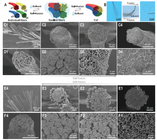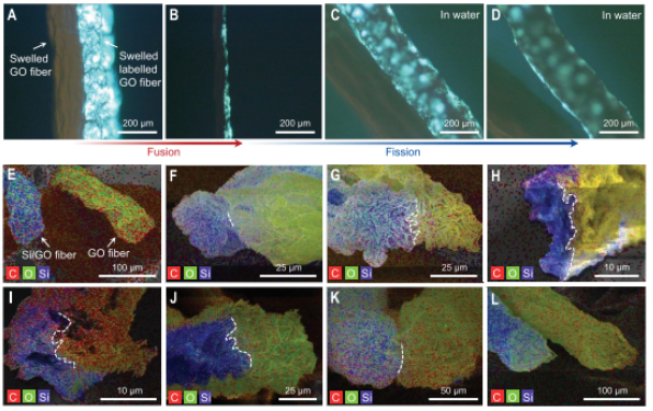 Figure 1. GO纖維的可逆融合和裂變。(A)溶劑觸發(fā)精確可逆的GO纖維自溶和自裂變原理圖。(B)~100 GO纖維和單個FuF-100纖維通過膨脹輔助融合和裂變可逆轉(zhuǎn)換的照片。(C-F)~100 GO纖維的融合過程(從左到右)和FuF-100的反裂變過程(從右到左)的連續(xù)掃描電鏡圖像。