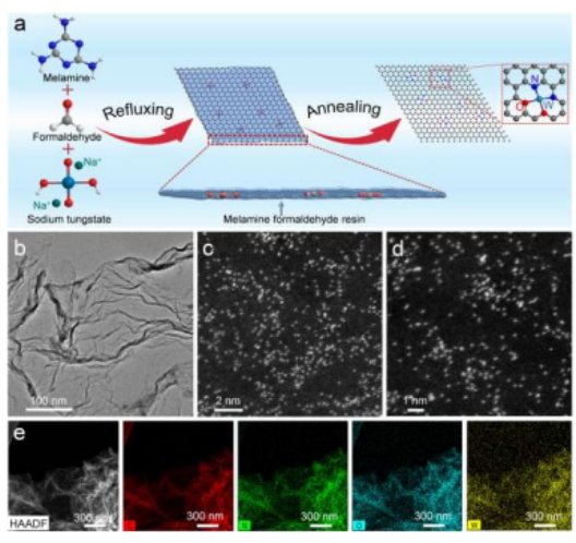 Figure 1. a)W/NG制備過程的示意圖。b)透射電鏡圖像。c,d)放大的HAADF-STEM圖像 e)HAADF-STEM圖像和相應的EDX元素分布圖。