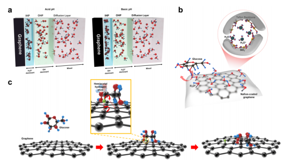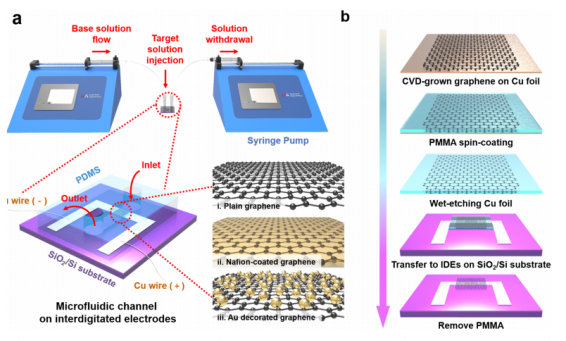 液體中離子和分子的檢測已為實現(xiàn)電子(智)舌受到了廣泛的關(guān)注。具有高靈敏度的溶液門控場效應晶體管(SFETs),可通過讀取電導來檢測出離子和分子。但是,迄今為止,采用SFETs的離子傳感器和分子傳感器具有局限性,例如缺乏動態(tài)開關(guān)功能且選擇性低。在本項研究中,作者評估了合理設(shè)計的石墨烯SFETs作為pH和葡萄糖選擇性傳感器。通過控制溶液的注入和抽出,微流體通道與石墨烯SFET集成,表現(xiàn)出動態(tài)的開關(guān)功能。當分別用Nafion作為分子篩和Au裝飾的納米顆粒作為受體時,石墨烯SFET裝置顯示出高pH和葡萄糖選擇性。采用定制石墨烯通道的SFETs具有動態(tài)開關(guān)功能和高選擇性,通過將單獨的SFETs集成可同時傳感多個目標陣列,具有發(fā)展為電子舌平臺的巨大潛力。