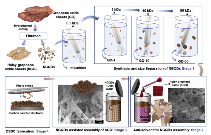 通過堆疊的石墨烯納米片,復雜電解質(zhì)的擴散限制了它們的電化學性能。作為一種潛在的解決方案,本研究探索了氮摻雜石墨烯量子點 (NGQDs) 在誘導多孔氧化石墨烯 (hGO) 納米片上3D多孔取向方面的潛力。用于相分離輔助組裝的NGQDs和反溶劑的尺寸經(jīng)過優(yōu)化,以實現(xiàn)3D納米多孔網(wǎng)絡。該納米網(wǎng)絡作為hGO多孔取向的軟模板,形成3D分層多孔碳結(jié)構(gòu)。受益于3D框架的孔隙率,從根本上避免了π-π重堆疊,提供了高電解質(zhì)傳輸速率。此外,NGQDs的摻雜氮和J型聚集有效地調(diào)整了能帶結(jié)構(gòu),以實現(xiàn)低過電位下的電荷轉(zhuǎn)移。復合結(jié)構(gòu)增強的電催化活性和極低的電荷轉(zhuǎn)移電阻歸因于增強的電極/電解質(zhì)界面和多維電荷和電解質(zhì)傳輸。基于多孔復合結(jié)構(gòu)的對電極在染料敏化太陽能電池中顯示出 78% 的光伏性能增強(與未改性的石墨烯相比),這與Pt電極的性能相當。所提出的 3D 多孔取向可用于新興的電催化應用,例如超級電容器、水分解和電池電極。