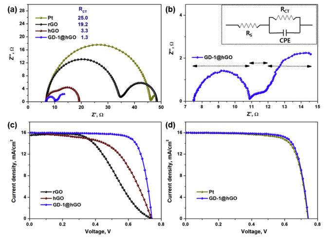 Figure 5. (a) rGO、hGO、NGQDs@hGO和Pt電極的奈奎斯特圖(插圖:RCT的變化)。(b) NGQDs@hGO的奈奎斯特圖。(c) 碳電極的J-V曲線,以及 (d) 優(yōu)化樣品與Pt電極的比較。