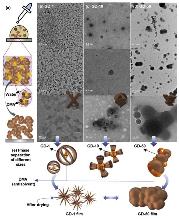 Figure 6. (a) NGQDs中的相分離機制和相關(guān)多孔取向的示意圖。(b,c,d) GD-1、GD10和GD-50中形成的聚集體的TEM分析;插圖顯示了NGQD組裝機制的示意圖。(e) 不同尺寸NGQDs中聚集動力學的近似值,以及干燥后組裝的差異。