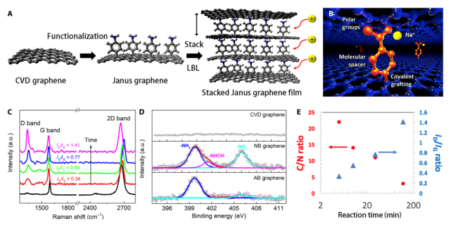 +存儲(chǔ)的納米石墨狀負(fù)極極,由僅在一側(cè)功能化的堆疊石墨烯片形成,稱為 Janus石墨烯。不對(duì)稱功能化使得Na