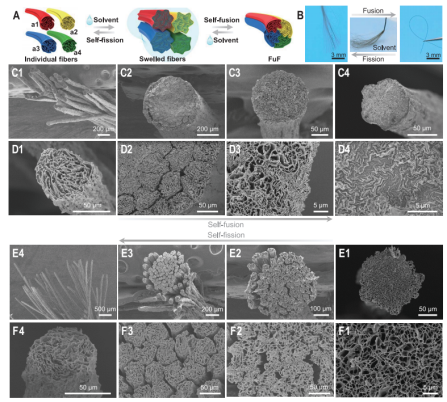刺激響應(yīng)融合和裂變在生物組織和人工分子組裝中被廣泛觀察到。然而,在重復(fù)聚變和裂變過程中,設(shè)計一個結(jié)構(gòu)和性能持久的系統(tǒng)仍然具有挑戰(zhàn)性。作者展示了濕紡氧化石墨烯 (GO) 纖維的可逆融合和裂變,其中許多宏觀纖維可以融合成更粗的纖維,也可以在溶劑的刺激下分離成原始的單根纖維。其中,由溶劑蒸發(fā)和滲透引起的GO纖維殼的動態(tài)幾何變形是可逆熔裂循環(huán)的關(guān)鍵。這一原理被擴展到實現(xiàn)復(fù)雜纖維組件和客體化合物的包含或排出之間的靈活過渡。