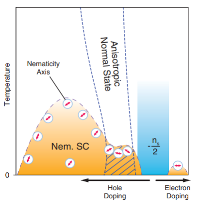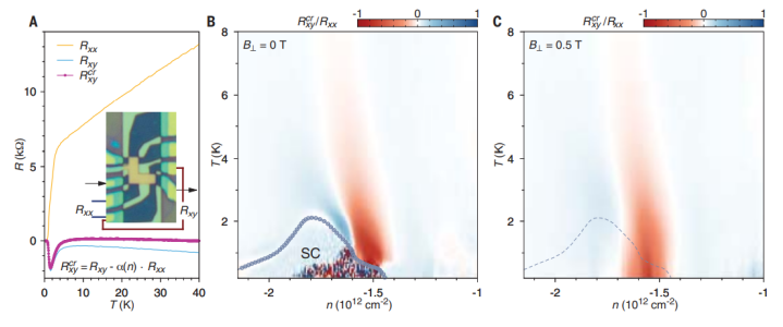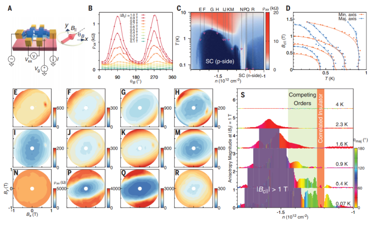在固態(tài)系統(tǒng)中,強(qiáng)相互作用電子通常在基態(tài)中顯示出多個(gè)破壞的對(duì)稱(chēng)性。不同階參數(shù)之間的相互作用可以產(chǎn)生豐富的相圖。報(bào)道了在魔角扭曲雙層石墨烯(TBG)中識(shí)別具有破碎旋轉(zhuǎn)對(duì)稱(chēng)性的纏繞相。利用橫向電阻測(cè)量,發(fā)現(xiàn)一個(gè)強(qiáng)各向異性相,位于超導(dǎo)圓頂?shù)那窊诫s區(qū)域上方的“楔形區(qū)”內(nèi)。當(dāng)它與超導(dǎo)圓頂交叉時(shí),觀察到臨界溫度的降低。此外,超導(dǎo)態(tài)表現(xiàn)出對(duì)與方向相關(guān)的面內(nèi)磁場(chǎng)的各向異性響應(yīng),揭示了整個(gè)超導(dǎo)圓頂?shù)南蛄杏行?。這些結(jié)果表明,向列波動(dòng)可能在魔角TBG的低溫相發(fā)揮重要作用。
