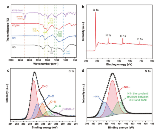 Figure 2. a) ATgGN、純GN以及初始材料GO和ATFB-TANI的FT-IR光譜。b) ATgGN的XPS譜。 c) C 1s和d) N 1s的高分辨XPS譜。