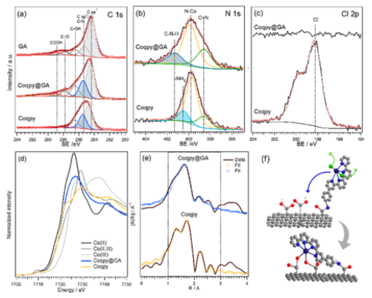 Figure 1. 對于GA, Coqpy@GA和Coqpy樣品,(a) C 1s, (b) N 1s和(C) Cl 2p XPS譜。Coqpy@GA和Coqpy樣品在Co K邊的(d) XANES和(e)的FT-EXAFS光譜。(f) Coqpy@GA的可能結(jié)構(gòu)。
