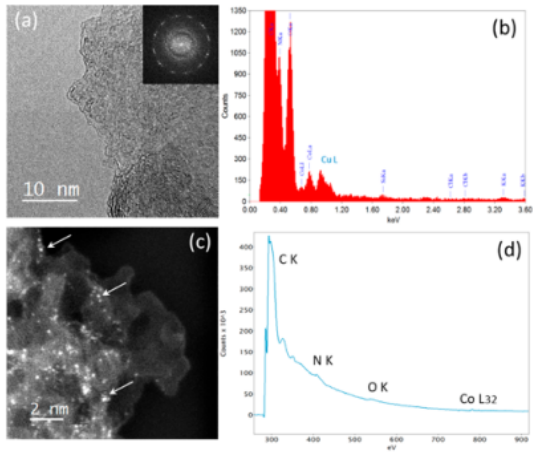 Figure 2. (a) Coqpy@GA的HR-TEM顯微圖(插圖為FFT)。(b)樣品的EDXS數(shù)據(jù),其中碳、氮、氧和鈷被觀察到,而氯不存在(Si和K被發(fā)現(xiàn)為雜質(zhì),Cu來自TEM網(wǎng)格)。(c) 樣品的薄片區(qū)域的原子尺度的HAADF-STEM圖像,其中單個Co原子(可能是氧原子)被觀察為亮點(箭頭表示Co原子可能的位置)。(d)存在C K-、N K-、O K-和Co L邊的EELS譜。