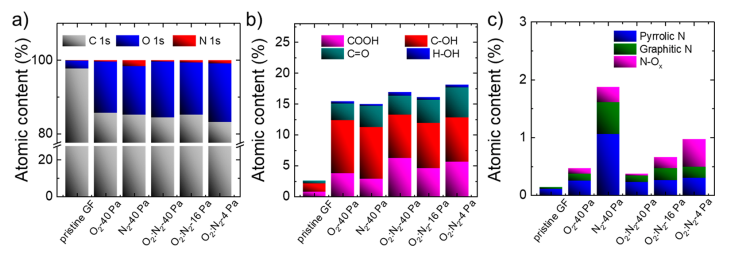 Figure 2. 原始和等離子體處理的GFs的化學(xué)表征。(a) 電極的元素組成。電極中 (b) O和 (c) N的分布。數(shù)據(jù)是根據(jù)XPS光譜(寬掃描、C 1s、O 1s 和 N 1s 光譜)的分析估算