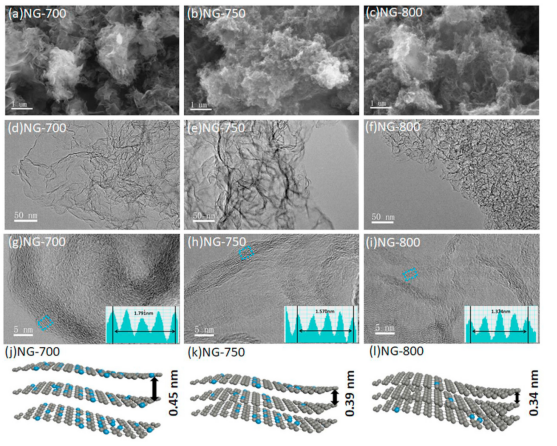 Figure 3. (a-c) SEM圖像;(d-f) TEM圖像;(g-i) HRTEM圖像;(j-l) 合成的NG-700、NG-750和NG-800樣品的晶面間距示意圖。