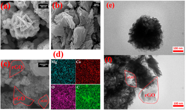 Figure 1. 花狀MgCo2O4 (a)、rGO納米片 (b) 和MgCo2O4-rGO (c) 的SEM圖像、MgCo2O4-rGO的EDX圖譜 (d) 和MgCo2O4 (e) 和MgCo2O4-rGO (f) 的TEM圖像。