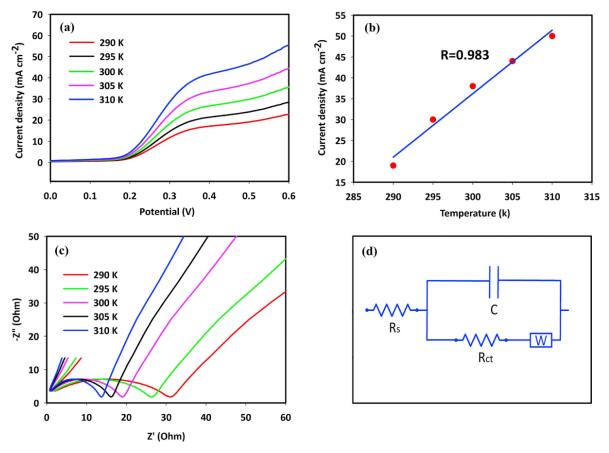 Figure 3. MgCo2O4-rGO在不同溫度下的 LSV 曲線 (a)、電流密度對溫度 (b);MgCo2O4-rGO在不同溫度下的 EIS 圖 (c) 以及相關等效電路(d)。