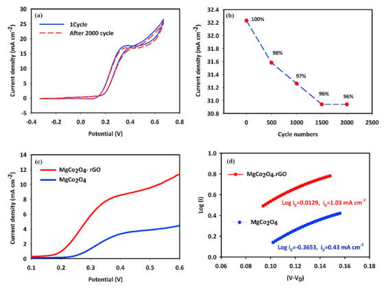 Figure 4. MgCo2O4-rGO的第 1 次和第 2000 次 CV 循環(huán) (a),MgCo2O4-rGO的電流密度與循環(huán)次數(shù) (b),以及MgCo2O4和MgCo2O4-rGO催化劑的 LSV 曲線 (c) 和相關的 Tafel 圖。
