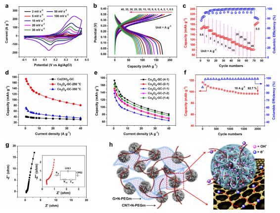 Figure 4. 電池型Co3O4-GC多級微球三元復合材料的電化學性能:(a)CV曲線,(b)GCD曲線,(c)倍率性能,(d)Co(OH)2-GC和Co3O4-GC復合材料的倍率性能。(e) Co3O4-GC復合材料在250 °C下燒結(jié)時的倍率性能。(f)循環(huán)性能。 (g) Co3O4-GC 的Nyquist 圖和等效電路(插圖)。(h) Co3O4-GC三元復合材料在KOH溶液中的充放電過程示意圖。