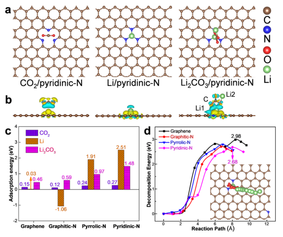 Li-CO2電池作為CO2捕獲和利用技術(shù)之一,在碳中和應(yīng)用方面引起了特別的興趣。然而,用于可逆Li2CO3形成和分解的低成本高效陰極催化劑的設(shè)計(jì)和制造仍然具有挑戰(zhàn)性。在這里,在理論計(jì)算的指導(dǎo)下,CO2被用來激活傳統(tǒng)摻氮石墨烯的催化活性,其中吡啶-N和吡咯-N的總含量很高(72.65%),并且在兩種CO2還原中都有很高的催化活性和演化反應(yīng),從而激活Li2CO3形成和分解的可逆轉(zhuǎn)化。因此,設(shè)計(jì)的陰極在1200 mA g-1下具有2.13 V的低電壓間隙和長(zhǎng)壽命循環(huán)穩(wěn)定性,在500 mA g-1下循環(huán)170次后電壓間隙小幅增加0.12 V。我們的工作提出了一種設(shè)計(jì)具有高活性的無金屬催化劑的方法,可用于激活Li-CO2電池的性能。