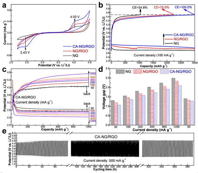 Figure 3. CA-NG/RGO、NG/RGO和NG對(duì)Li-CO2電池的電化學(xué)性能。