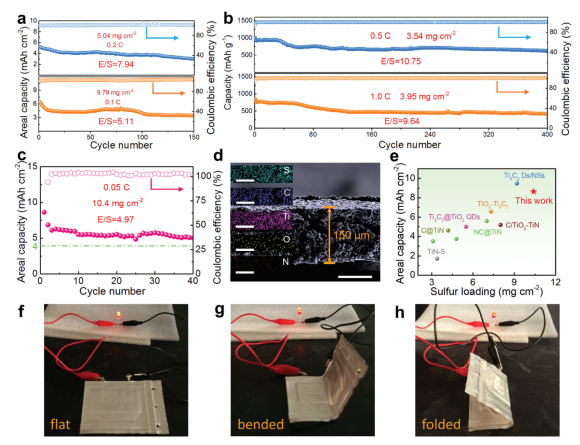 Figure 4. a) 0.1 C下,G-TiO2/TiN@S正極的循環(huán)性能。b) 0.5 C和1.0 C下,G-TiO2/TiN@S 正極的循環(huán)性能。c) G-TiO2/TiN@S正極在0.05 C下的循環(huán)性能。d) G-TiO2/TiN@S正極的橫截面 SEM 圖像和相應的元素圖。e) 與其他報道的鈦基硫主體相比,高負載G-TiO2/TiN@S正極的面積容量。f-h) 演示處于各種彎曲狀態(tài)以連續(xù)點亮LED指示燈的Li-S軟包電池。比例尺:100 µm (d),插圖:150 µm。