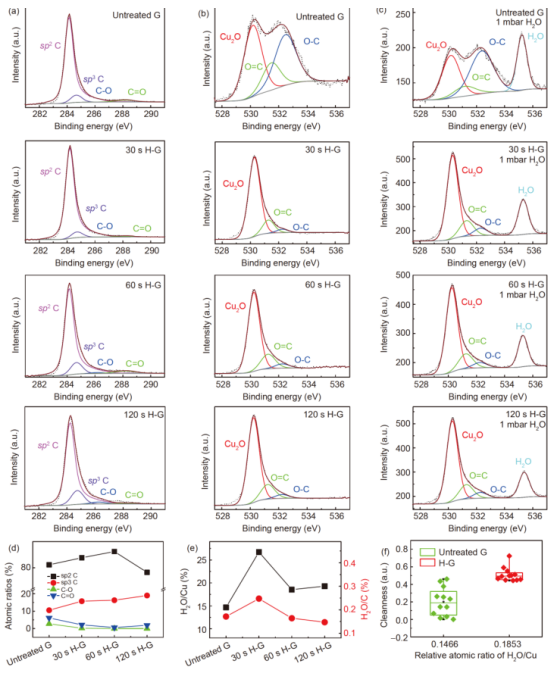 2O存在下的高分辨率O 1s光譜。(d)UHV中C 1s的原子比。(e)從計算峰面積的Cu(黑色)和C(紅)和C(紅色)的相應(yīng)原子比。(f)表面清潔與水吸附之間的相關(guān)性,用于未處理的G和60 s H-G。