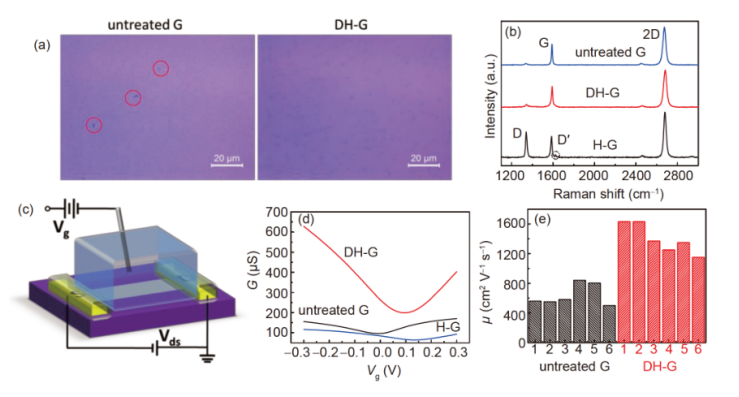 圖4 脫氫后石墨烯的光學和電性能。 (a)未處理的G和DH-G的光學顯微鏡圖像。紅色圓圈表示與聚合物殘留物污染的斑點。 (b)60s H-g的拉曼光譜,在350℃下退火1小時后的DH-G,并在Si晶片上未處理的G. 使用2.33eV(532nm)激光激發(fā)來記錄光譜。 (c)在液體門控構(gòu)型制造的GFET的示意圖。 (d)電導(dǎo)(G)作為未處理的G,H-G(60s)和在Si晶片上轉(zhuǎn)印的H-G(60s)和DH-G的柵極電壓(Vg)的函數(shù)。 (e)未處理的G和DH-G的遷移率(μ)值的比較。所有測量都在室溫下在環(huán)境條件下進行。