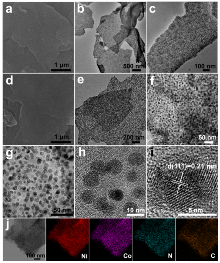 圖2 rGO/CoNi-MOC前驅(qū)體的(a) SEM和(b,c) TEM圖像。(d) rGO/CoNi-N納米復(fù)合材料的SEM圖像,(e-h) TEM圖像,(i) HRTEM圖像和(j) EDX能譜