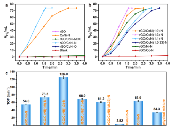 探索經(jīng)濟(jì)高效的氨硼烷(AB)脫氫催化劑是實(shí)現(xiàn)氫經(jīng)濟(jì)的迫切需要。過(guò)渡金屬氮化物(TMNs)在各種儲(chǔ)能/轉(zhuǎn)換系統(tǒng)中受到了廣泛關(guān)注,但在AB脫氫中的應(yīng)用研究卻很少。在此,我們提出了一種綠色的方法,將Co摻雜的氮化鎳納米顆粒錨定在雙金屬有機(jī)配合物中還原的氧化石墨烯納米片(rGO/ CoNi-N)上。結(jié)果表明,該催化劑具有優(yōu)異的AB脫氫催化性能,TOF值為126.0 min