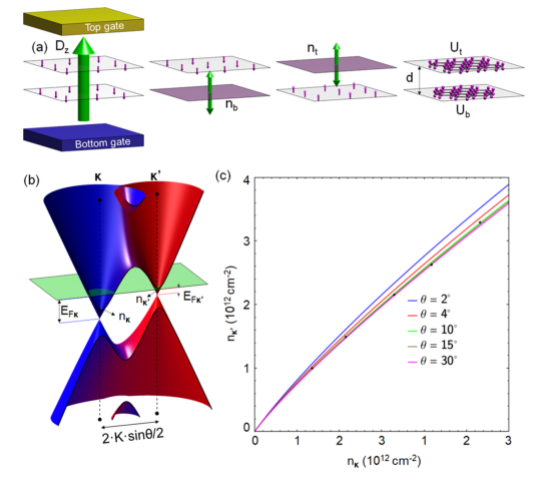 圖1. (a) 說(shuō)明每個(gè)單層的介電極化率如何進(jìn)入雙層靜電分析的草圖。 (b) tBLG 中的特征電子色散(此處,θ = 3°;u = 100 meV)。 頂層/底層的電子態(tài)幅度用紅色/藍(lán)色表示。 (c) 單門(mén) tBLG 中的微谷載流子密度 n