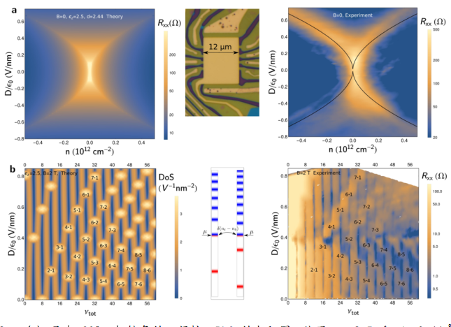 z= 2.5 和 d = 3.44 Å(左)計(jì)算并測(cè)量(右)作為總載流子密度 n 的函數(shù),和垂直位移場(chǎng) D,在 B = 0 和 T = 2 K。 (b) 在 B = 2 T 的 30° tBLG 中計(jì)算的釘扎 LLs(左)和測(cè)得的電阻 ρxx(右)的狀態(tài)密度 ,繪制為位移場(chǎng)和填充因子的函數(shù)。明亮的區(qū)域?qū)?yīng)于標(biāo)記的 N