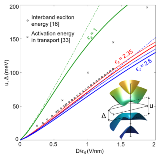 圖 3. 未摻雜 BLG 中的層間不對(duì)稱電位(虛線)和帶隙(實(shí)線),使用不同的 ?