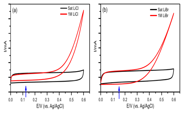 Figure 1.(a)MXene電極在稀釋和濃縮的(a)LiCl和(b)LiBr電解質(zhì)溶液中的循環(huán)伏安圖,以10 mV/s測試。藍色箭頭代表集中系統(tǒng)中電極的OCV。