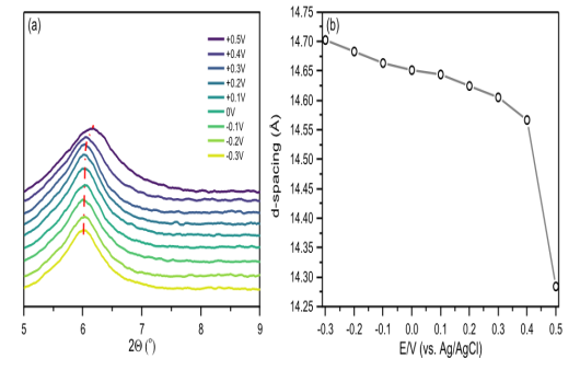 Figure 5.(a)在-0.3至0.5 V電位掃描期間測量的2q值的變化(相對于Ag/AgCl)。(b)MXene電極d間距的相應(yīng)變化。