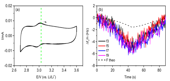 2電極的CV響應(yīng)。掃描方向由黑色箭頭指示。(b)在電位掃描期間記錄的頻率變化。理論頻率變化顯示為黑色虛線。