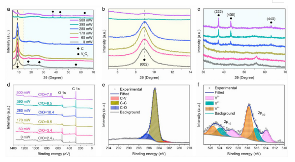 7/rGO 電極在390 mW時(shí)C 1s和(f)V 2p 的XPS圖,注:0 mW 對(duì)應(yīng)于激光劃線前的原始薄膜。
