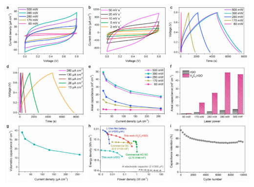 7/rGO MSCs面積比電容與電流密度的關(guān)系。(f)不同激光功率下 V