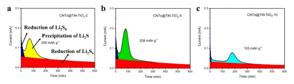 2-10的多硫化物吸附能力;(b-c)CNTs@TiN-TiO