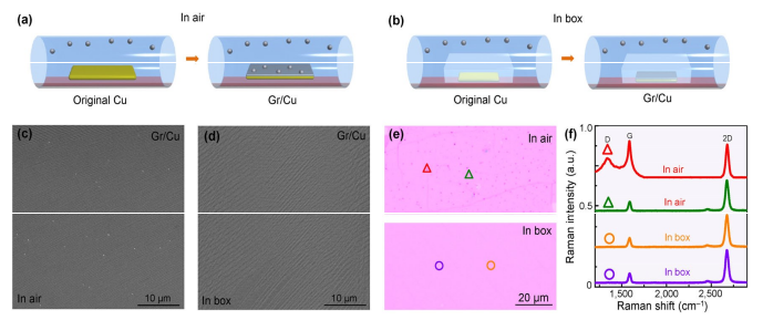 Figure 1. 消除CVD石墨烯中的“孔洞缺陷”。(a)石墨烯在銅箔襯底上生長(zhǎng)過(guò)程示意圖。(b)石墨烯在耐熱盒子輔助的銅箔襯底上生長(zhǎng)過(guò)程示意圖。(c)沒(méi)有盒子石墨烯生長(zhǎng)的代表性SEM圖,表面有很多顆粒。(d)在耐熱盒中石墨烯生長(zhǎng)的代表性SEM圖,表面非常干凈均勻。(e)石墨烯在沒(méi)有(上面板)和(下面板)盒子的情況下轉(zhuǎn)移到SiO