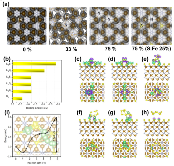 2N作為活性催化位點(diǎn)降低了鋰硫化物的分解勢(shì)壘,促進(jìn)了鋰多硫化物與鋰硫化物之間的轉(zhuǎn)化動(dòng)力學(xué),提高了電化學(xué)性能。Fe