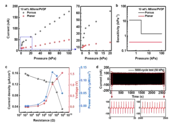 Figure 3. 多孔MXene/PVDF電子皮膚的壓電傳感性能。(a)多孔結(jié)構(gòu)和薄膜結(jié)構(gòu)的10 wt% MXene/PVDF電子皮膚之間的壓電傳感性能比較。(b)多孔和薄膜結(jié)構(gòu)的MXene/PVDF電子皮膚的壓電靈敏度分析。(c)相對(duì)于103至109 Ω的外部負(fù)載電阻的壓電輸出性能參數(shù)(電壓、電流密度和功率密度)。(d)MXene/PVDF電子皮膚在5000次50 kPa加載-卸載循環(huán)中的循環(huán)穩(wěn)定性測試。