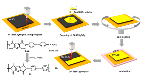 圖1. 制備氮硼共摻雜致密激光誘導(dǎo)石墨烯(NB-dLIG)的示意圖