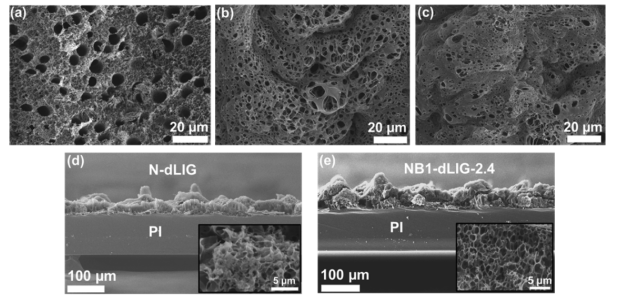 圖2. (a)未摻雜sLIG、(b) N-dLIG和(c) NB1-dLIG-2.4的掃描電子顯微鏡(SEM) 俯視圖;(d) N-dLIG和(e) NB1-dLIG-2.4的橫斷面掃描電鏡圖像及其相應(yīng)的高倍圖像(插圖)