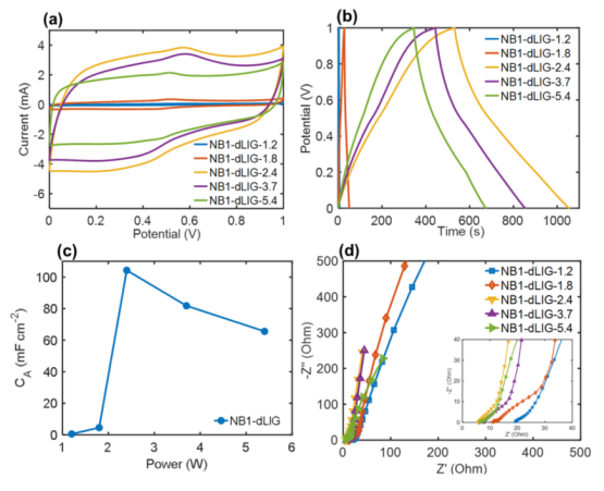 2時(shí),不同功率合成的NB1-dLIG電極的二次激光熱解的恒電流充放電(GCD)曲線;(c)電流密度為0.2 mA/cm