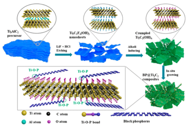 Figure 1. 合成具有強 Ti-O-P 鍵的皺縮BP@MXene(BP@Ti