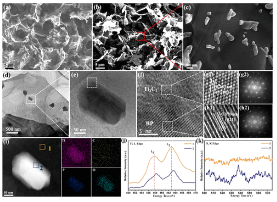 x 網(wǎng)絡和(b和c)皺縮的異質結構BP@MXene復合材料的SEM圖,放大倍數(shù)增加。(d)在MXene 薄片上生長的BP納米顆粒的低倍放大和(e)放大TEM圖。(f)MXene-BP界面的HRTEM圖,取自(e)部分中的白色虛線框。(g1)MXene的HRTEM圖和(g2)相應的FFT結果。(h1)BP的HRTEM圖和(h2)相應的FFT結果。(i)異質結構BP@MXene復合材料的HAADF圖和相應的EDS映射圖。(j) Ti L-edge和(k) O K-edge的電子能量損失譜,取自MXene薄片(第i部分中的區(qū)域1)和附近MXene-BP界面(第i部分中的區(qū)域2)。